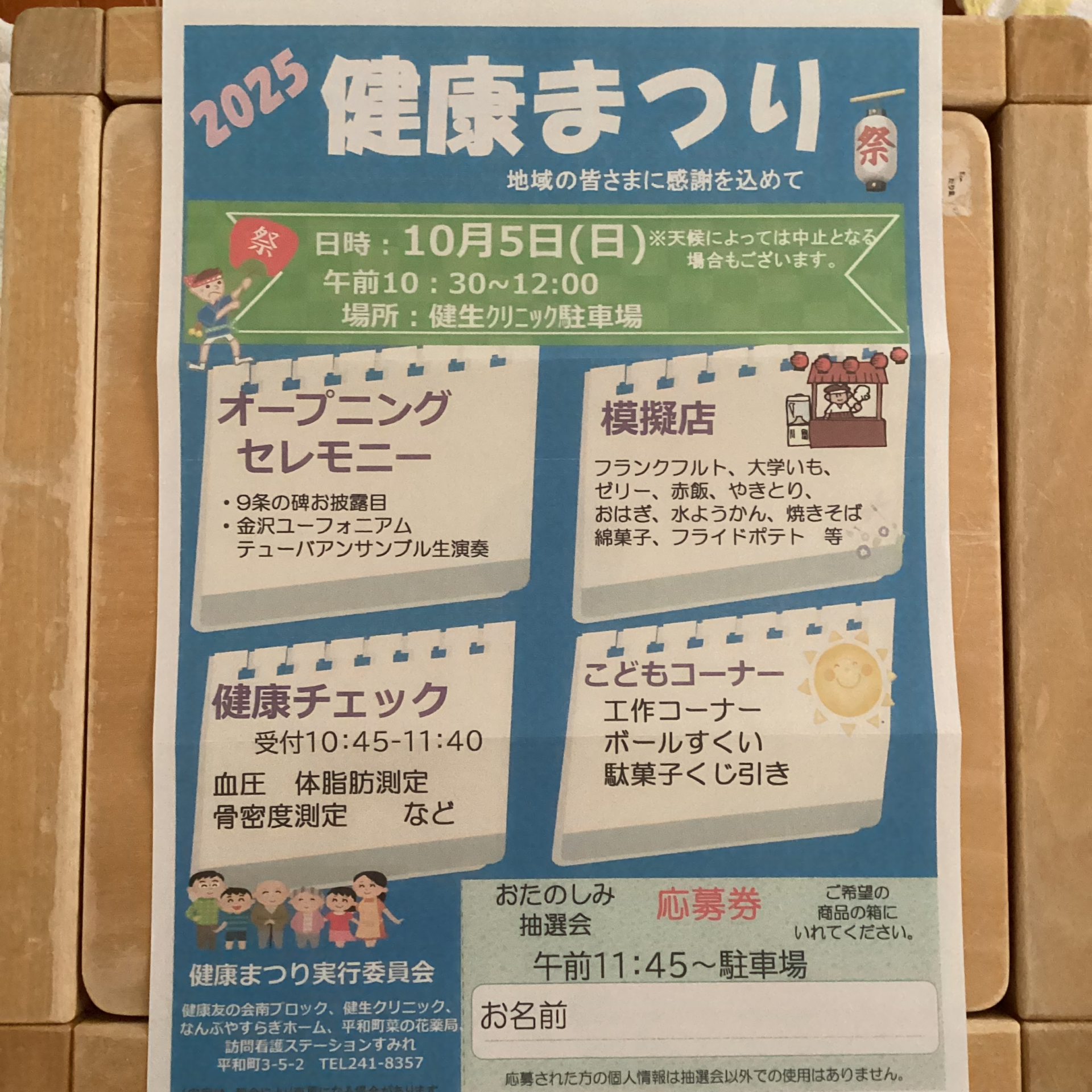 10月5日(日)、健生クリニック駐車場で健康まつりが開催されます。