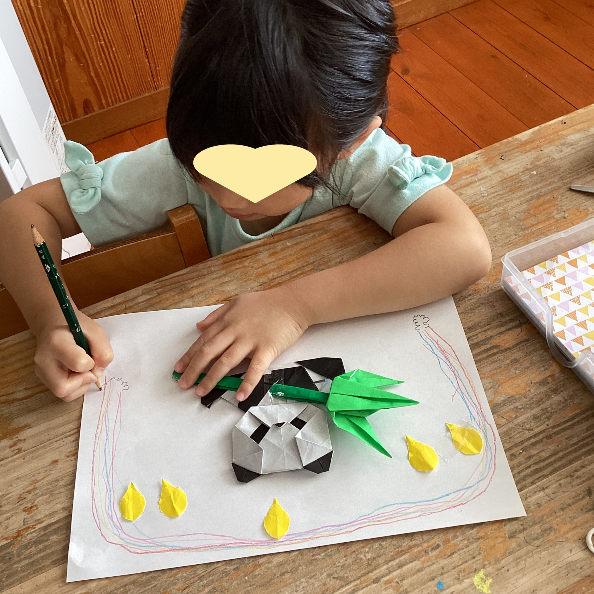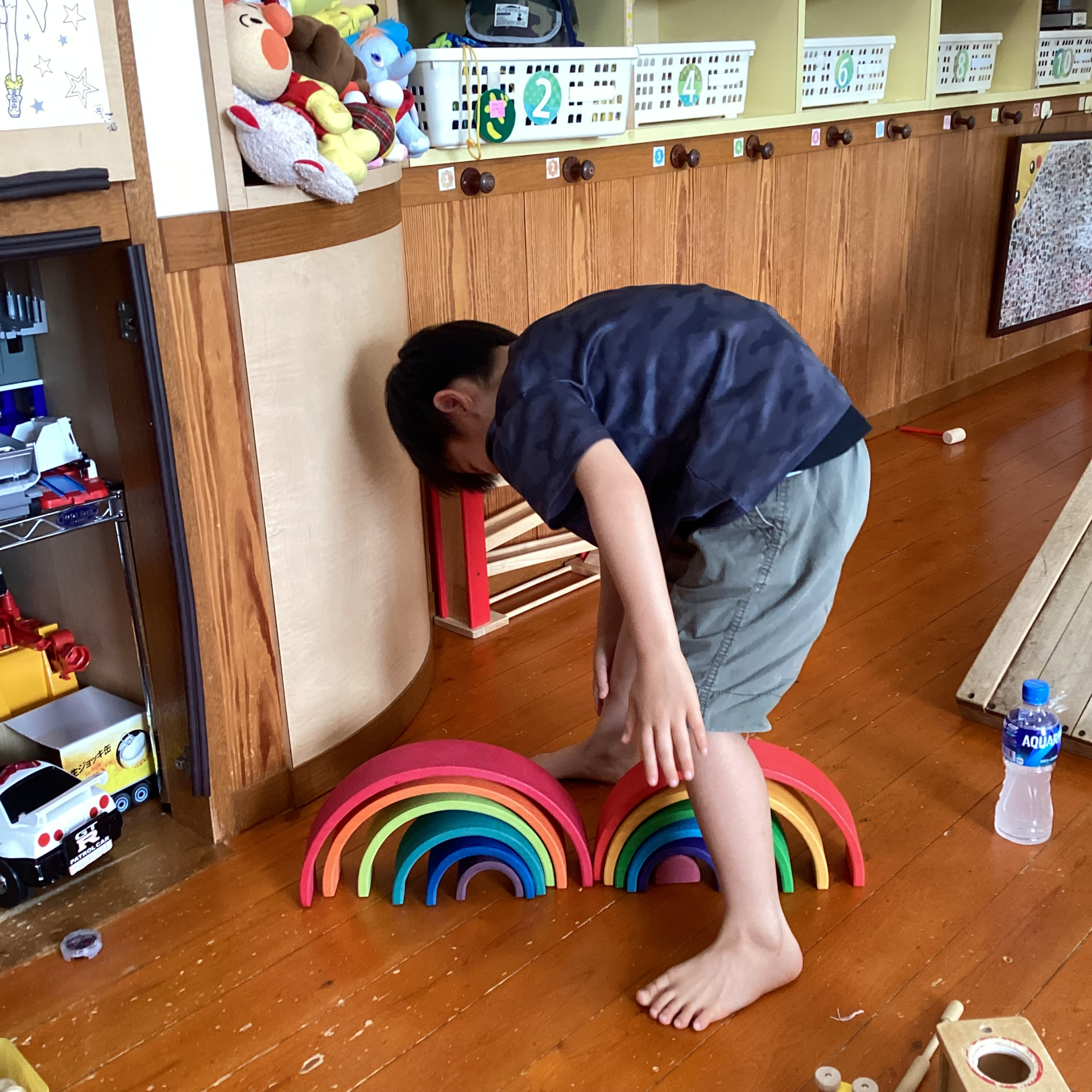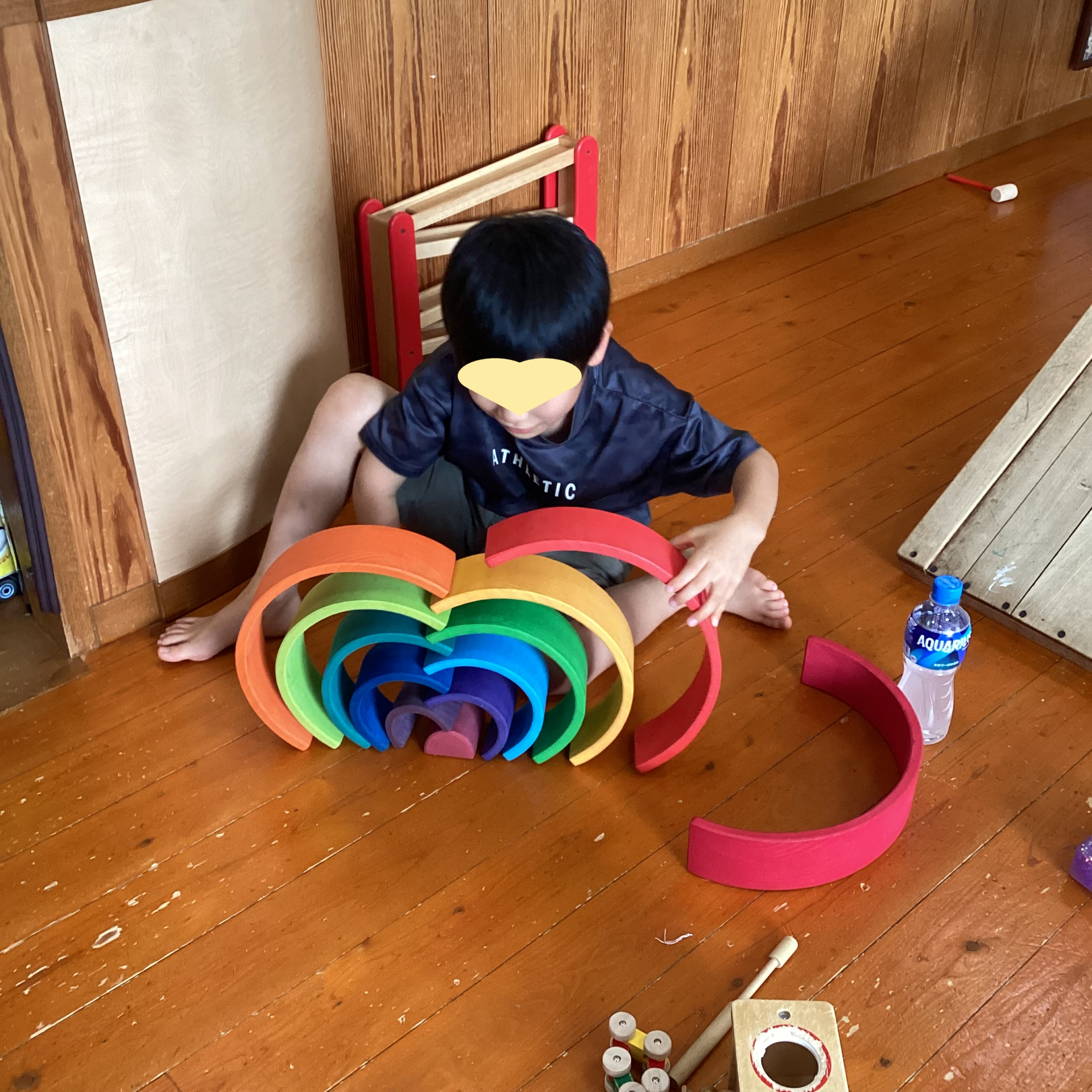 Kくん。虹のつみきを使っていろんな形を楽しんでいました。
